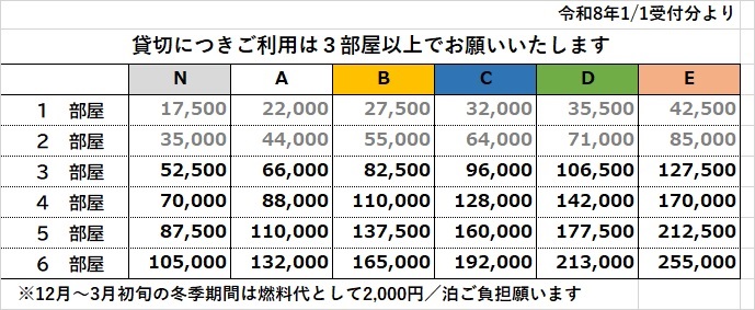 貸し切り期間中は、人数にかかわらず、何室お使いになるかでお値段が決まります